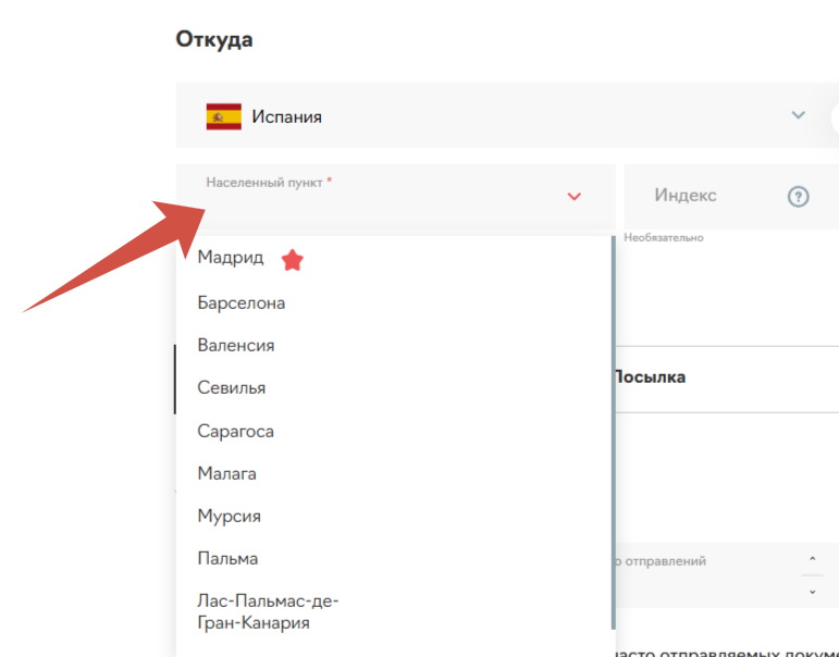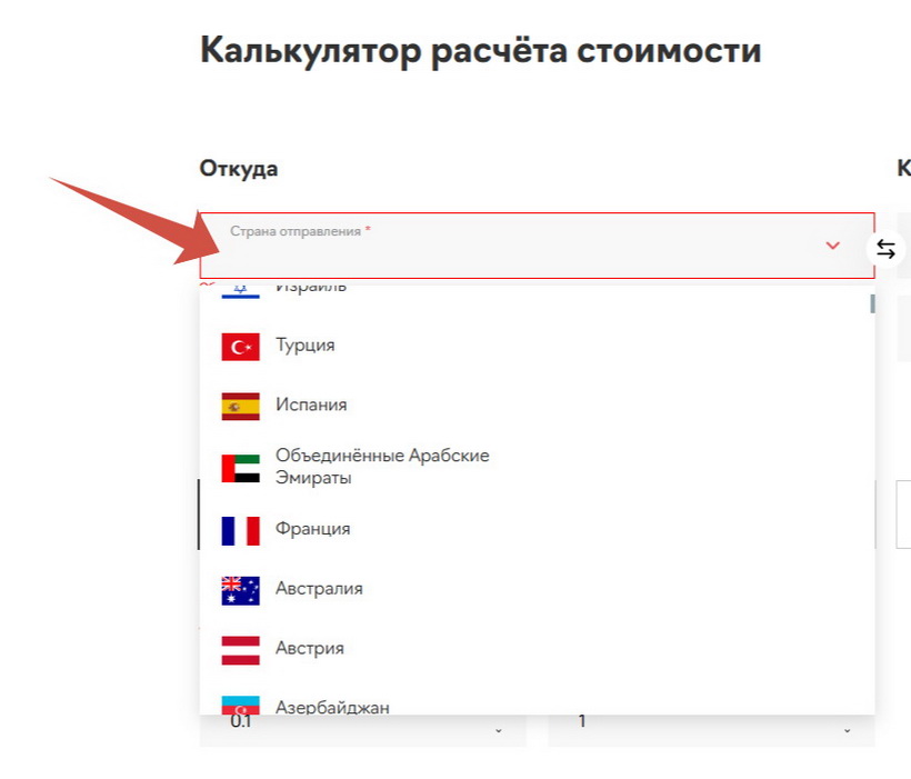 Страна отправления. В разделе слева «Откуда» в поле «Страна отправления» выберите в выпадающем списке страну, из которой планируется отправка, или начните вводить название страны, чтобы не скроллить весь перечень. Для наглядного примера возьмем Испанию.