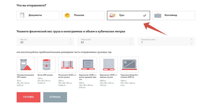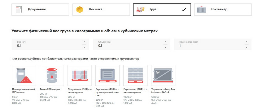Нажмите подходящий вариант — параметры в калькулятор стоимости доставки подставятся автоматически.