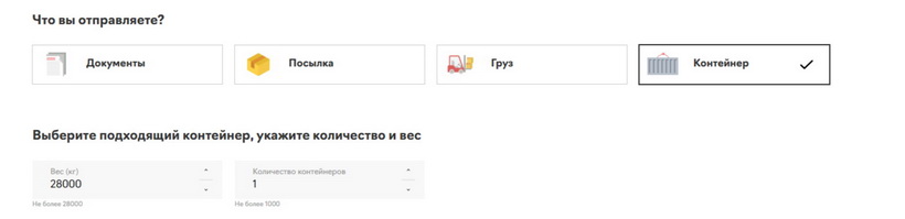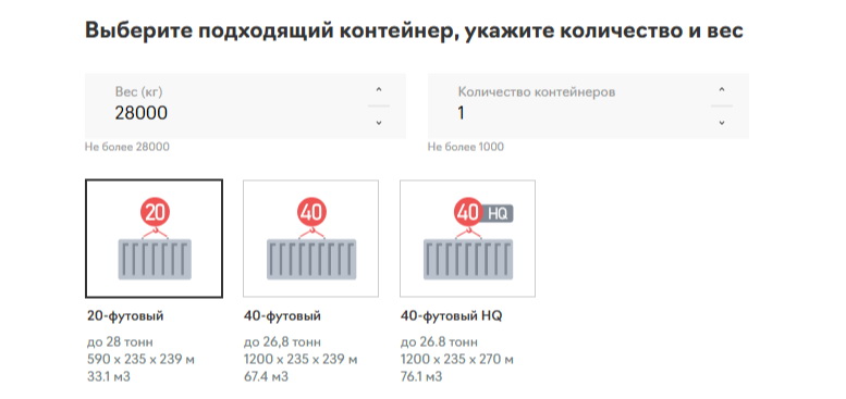 В поле «Количество контейнеров» выберите, сколько контейнеров вам нужно отправить: если груз помещается в один — ставьте 1, если партия большая — выберите нужное количество.