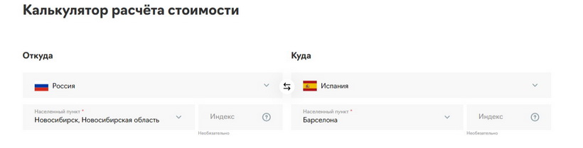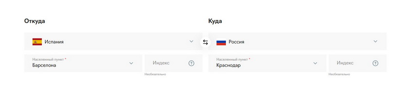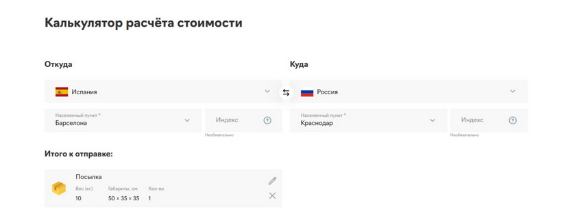 Рассмотрим функции и возможности онлайн-калькулятора на примере расчета международной доставки из Испании, г. Барселона в Россию, г. Краснодар, посылки весом 10 кг.