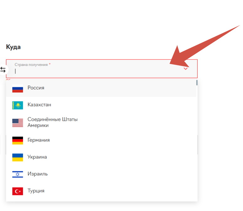 Страна получения. В разделе справа «Куда» в поле «Страна получения» выберите в выпадающем списке страну, в которую планируется доставка, или начните вводить название страны, чтобы не скроллить весь перечень. Для наглядного примера возьмем Россию.