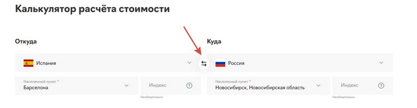 Чтобы рассчитать стоимость международной доставки в обратном направлении, например, из России в Испанию, просто кликните на стрелки между странами.